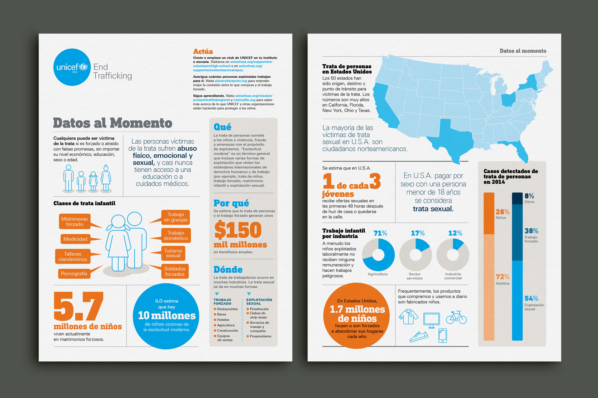 Led the visual system development for UNICEF USA infographics addressing trafficking and labor issues. The work focused on organizing dense research into clear, consistent visual structures used for education and advocacy, and designed to be broken into social shareables to extend reach and awareness.