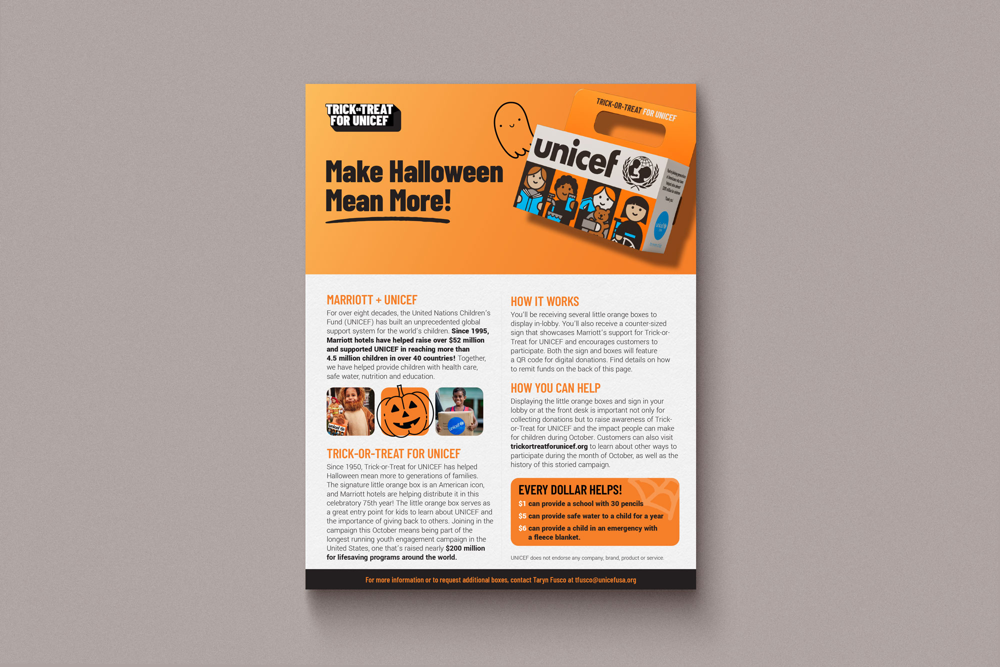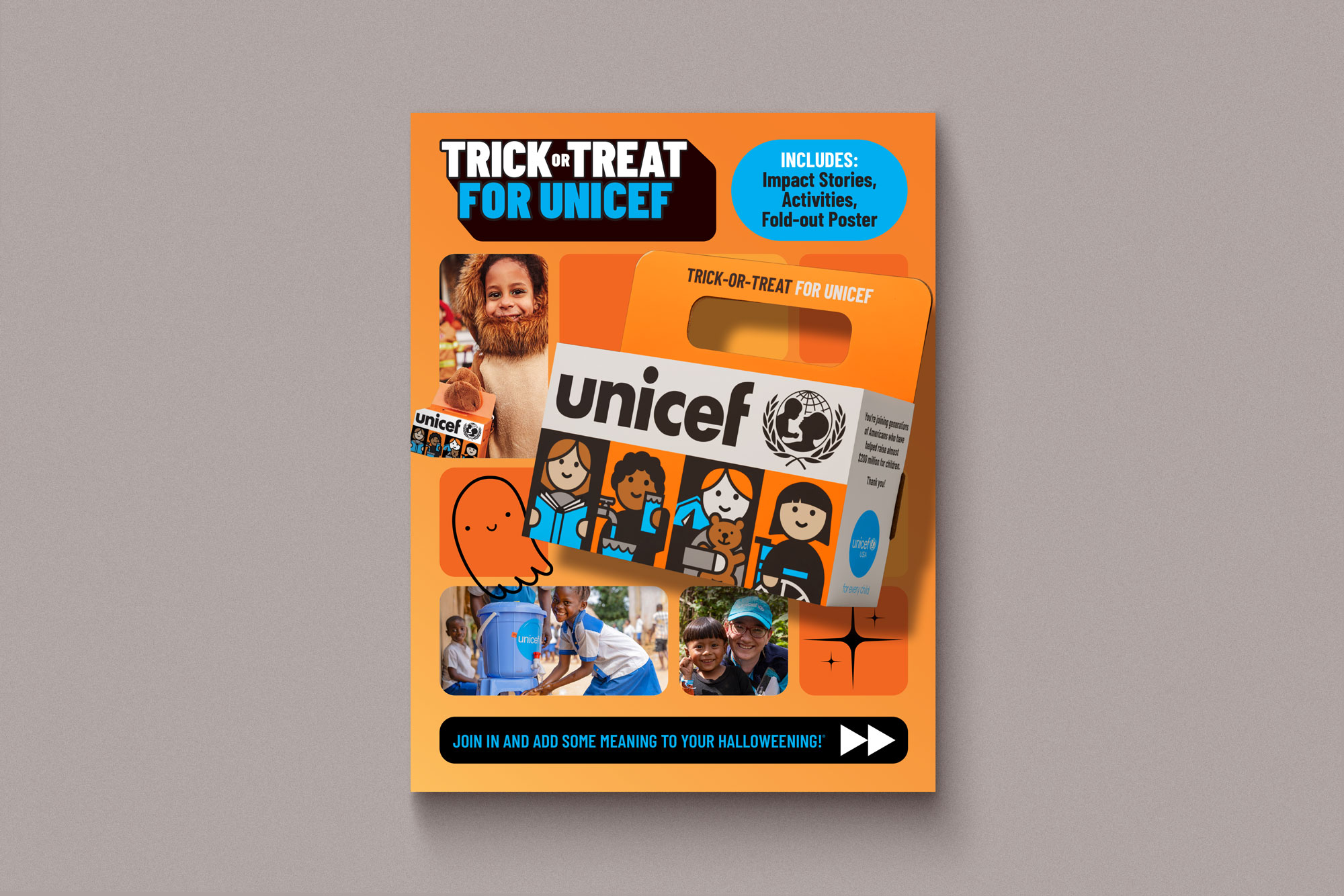Materials supporting the 75th year of UNICEF USA Trick-or-Treat for UNICEF, illustrating how a long-running initiative continues to evolve within a consistent brand system. The work spans print, digital, video, and social touchpoints, balancing kid-friendly engagement with clear structure to support participation, fundraising, and storytelling across generations.