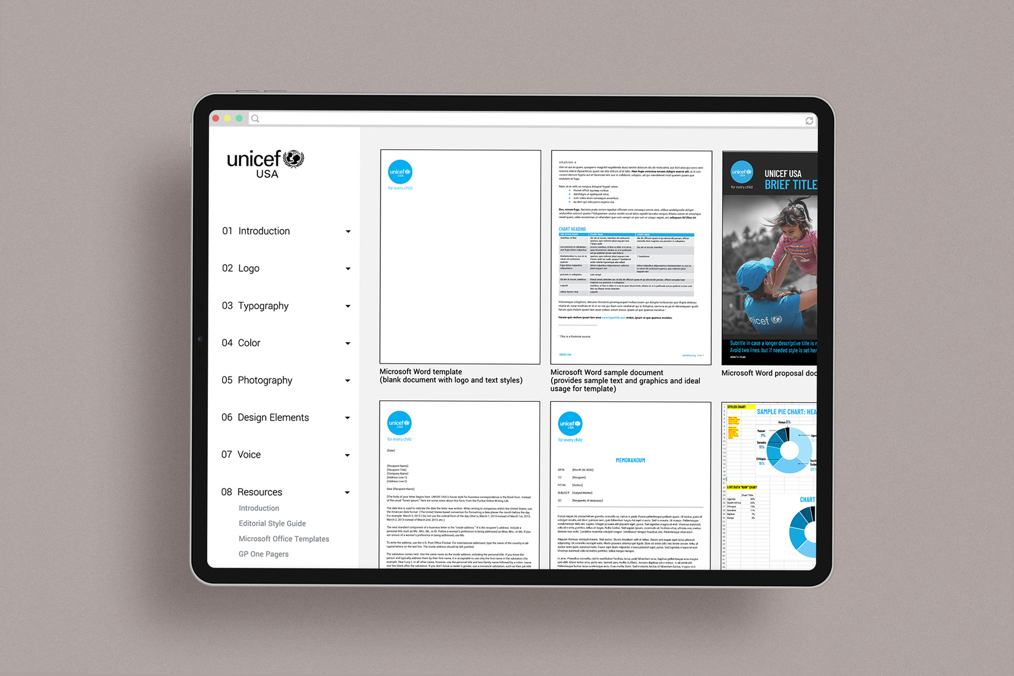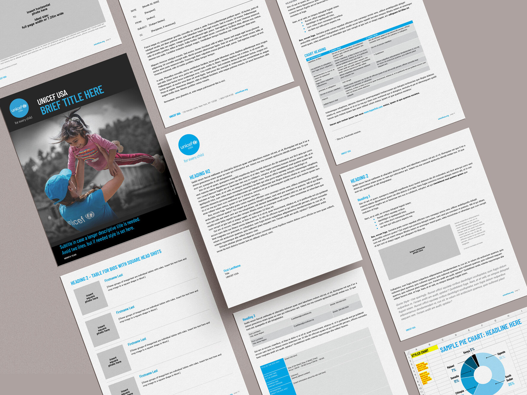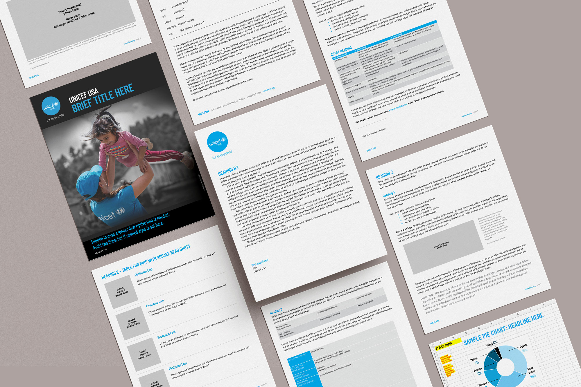 A standardized MS Office template system translating UNICEF USA brand standards into pre-formatted Word and Excel files. Styles are fully built in to support easy, consistent on-brand use, with templates deployed directly to staff laptops to ensure accessibility, adoption, and long-term consistency across teams.